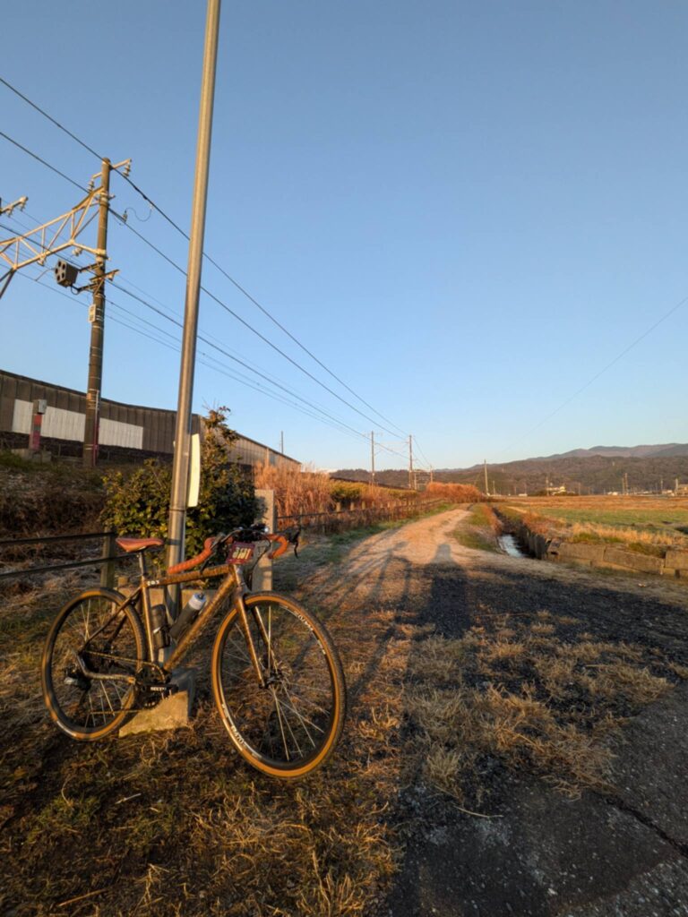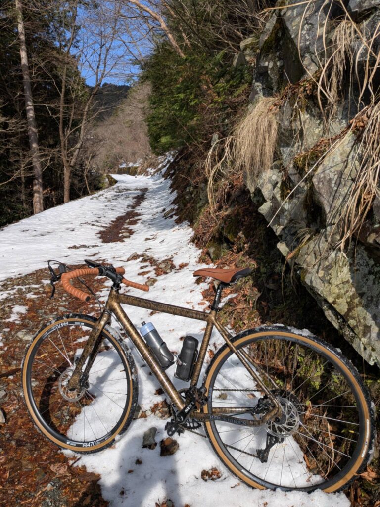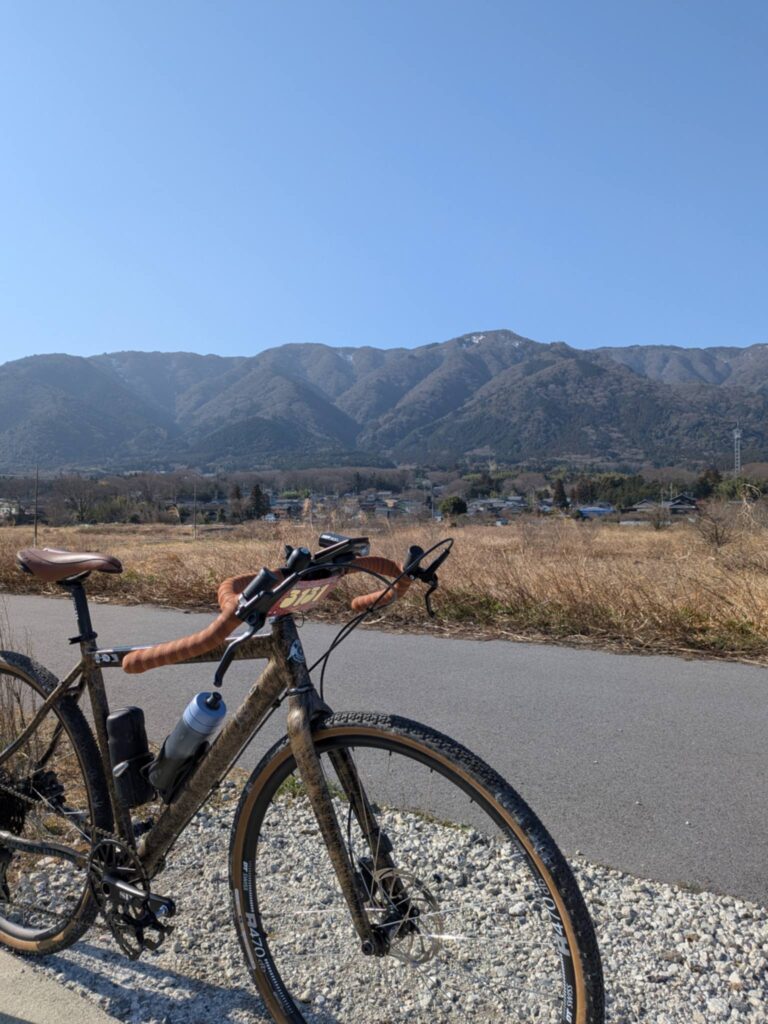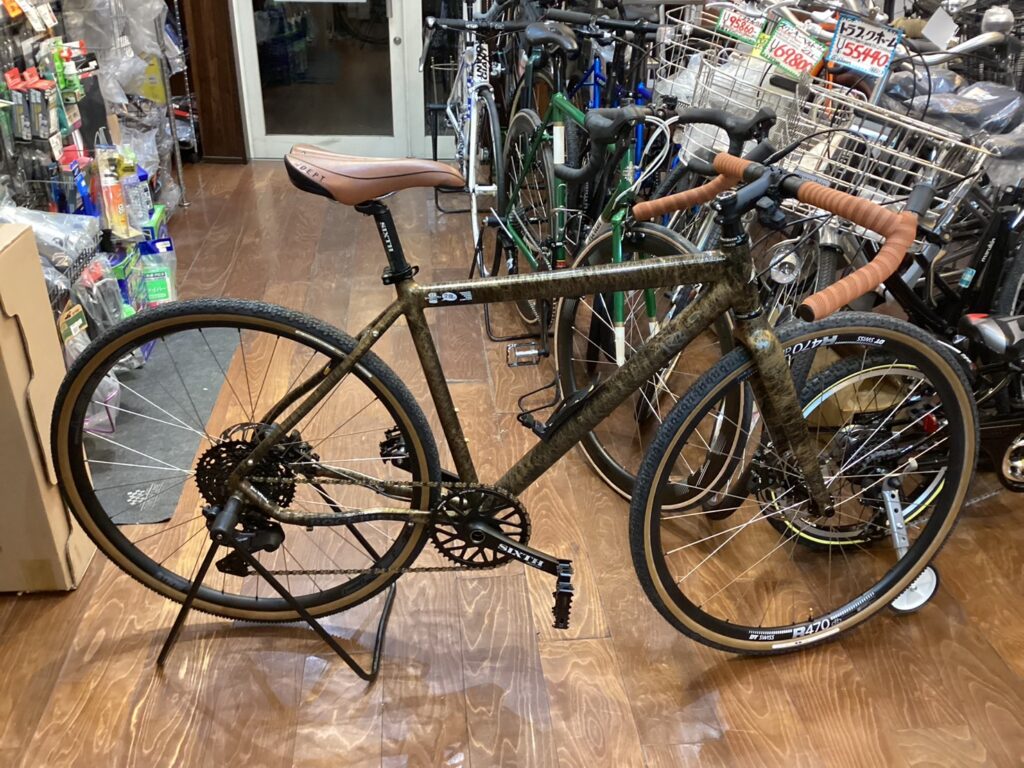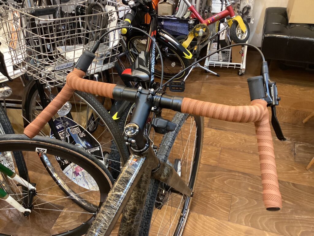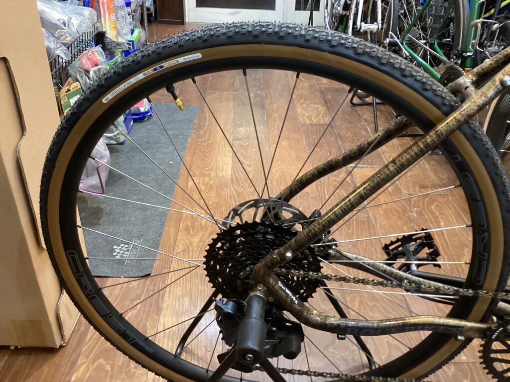 こちらをクォートで武装しハンドルはロングや荒れ地にも対応できるようにワイドでフレア形状のバーハンドルをチョイス。タイヤにはパナレーサーのグラベルキングX1。ギヤ構成はフロント46t カセットは11-45t(11速)です。