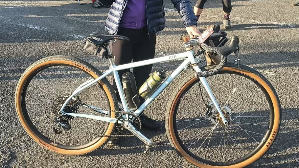 AYABIKESのオールロードバイク。ハンドメイドバイクブランドの車両で、ヘッド周り、ハブ、クランクのパーツも抜かりなし!ですがギヤ構成もタイヤも実用性抜群でカラーの使い方もお洒落なついつい目を惹かれる素敵なバイクでした。クロモリフレームって魅力ありますよね。