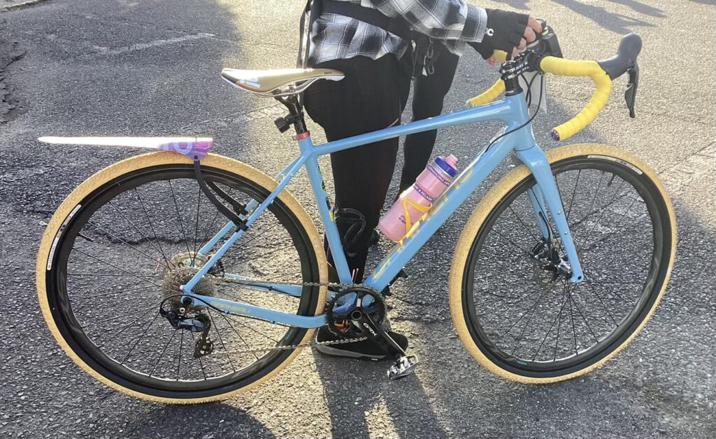 GARNEAUのグラベルバイク。女性ライダーの車両で色使いが可愛い!とても明るい方でそのイメージにピッタリ。まさにトータルコーディネートな一台でした。統一感があってすごくお洒落ですよね。